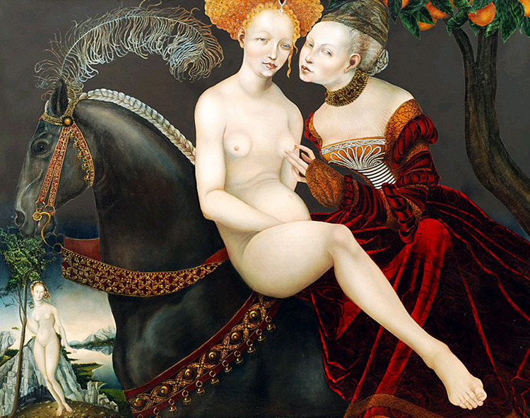 На ее картинах запечатлены сцены из мифов и библейских сказаний, а иногда и просто придуманные ею самой истории. Они населены полунагими красавицами, единорогами, экзотическими птицами и рыбами, плодами гранатов и райскими яблоками. Все это напоминает мрачную сказку, где прекрасное и уродливое перемешаны друг с другом. Как у старых мастеров женщины на картинах Йоанны худы, но имеют округлые животы. Из тела одной вырастает змея, другая превращается в хамелеона, у третьей к бедрам прибиты фазаны. Ее картины полны символических предметов и колеров. Здесь все что-то означает. Ее захватывают тема, которые пришли к нам через века, история иконографии. "Я изучаю старинные тексты, символы, 0 говорит Йоанна, - но я не люблю объяснять свои картины. Мне нравится утверждение, что каждый, кто видит картины, пишет ее заново". У мастеров эпохи ренессанса Йоанна перенимает тайны мастерства. "Когда я пишу ткань или украшения, - говорит художница, я стараюсь следовать мельчайшим подробностям. Иного при этом я использую реквизиты, но чаще всего нахожу то. что мне нужно в альбомах, у Кранаха, например. я позаимствовала сетки для волос". Над ожерельем из жемчуга или вышитой атласной юбкой Йоанна провела долгие недели. Тоненькими кисточками с точностью часовщика она воспроизводила каждый отсвет, каждую золотую нить. "Для меня не существует каких-то особых правил, - говорит Йоанна. - Просто прихожу утром в мастерскую и принимаюсь за работу, не разговариваю, не пью чай, не подхожу к телефону. когда обдумываю картину в мастерской царит идеальная тишина". Она не делает эскизов, а просто сочиняет историю, которую потом переносит на полотно.